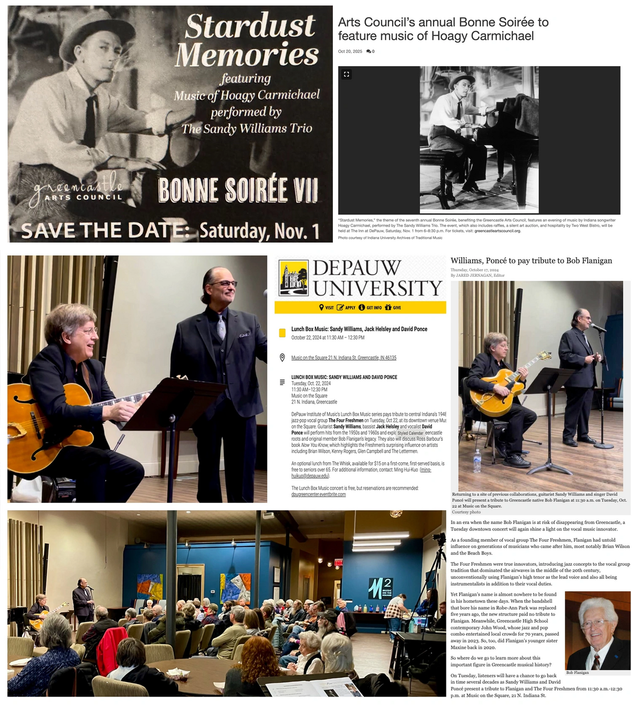 My friend (and collaborator on the Someday Songs project), guitarist Sandy Williams, has invited me on a few occasions to participate in a really cool event sponsored by DePauw University and also for events sponsored by The Arts Council of Greencastle, Indiana. Here are some links and other content for some of those events...